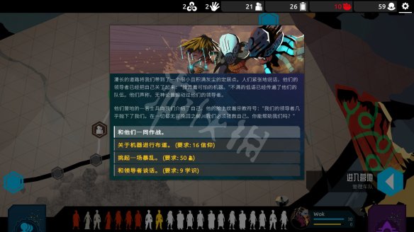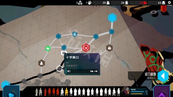 旅行会消费食物和希望。地图是随机生成的,地图中会遇到各种随机的事件,玩家的目标就是从左下角初始位置到达右上角的终点即可。旅途中红色的区域是危险区域,但是通过后会获得更多奖励。绿色和黑色区域是可以修整(治疗部队或者先知)的地点,并且获取一些必要的资源(食物和希望),需要注意的是修整是要消耗资源的。