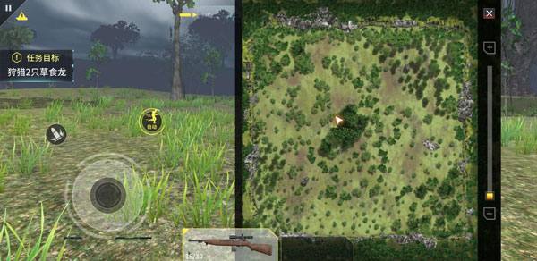 操作与界面详解 屏幕两侧均可开火,一键开镜实现精准远程打击,支持实时切换武器与快速换弹。右上角小地图提供全局地形概览,助你规划狩猎路线。