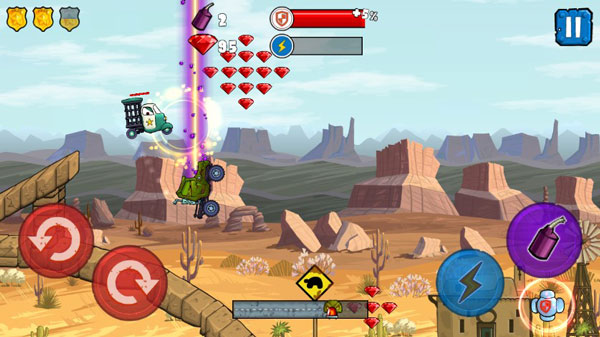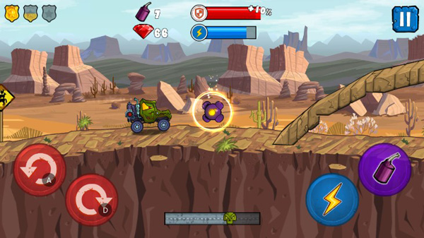 针对于游戏的玩法来说,其实还是比较简单的,左侧主要控制着赛车的重心,右侧以加速和炸弹释放为主,期间关卡中还有许许的障碍和路道设计,让每一关都尽显特色。