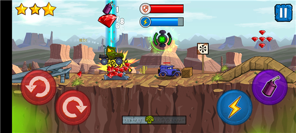 7、在闯关的图中,我们需要使用炸弹炸毁途中的车辆,获得燃油和钻石奖励,