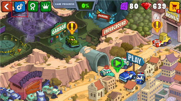 1、打开汽车吃汽车3最新破解版,点击左上角【齿轮】图标,
