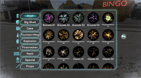 - 炮弹种类:锦缎、菊花、经典、十字炮、大丽花、幽灵炮弹、马尾炮、频闪炮、礼炮、柳树炮、彗星炮、喷泉炮、地雷。
