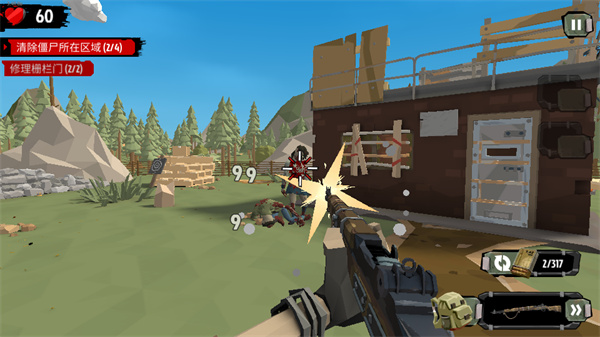 3、游戏中有两种射击模式,一种手动射击一种自动射击,屏幕左侧可以控制角色移动,屏幕右侧可以控制角色视角,调整位置击杀那些丧尸吧。