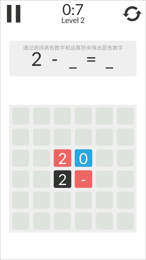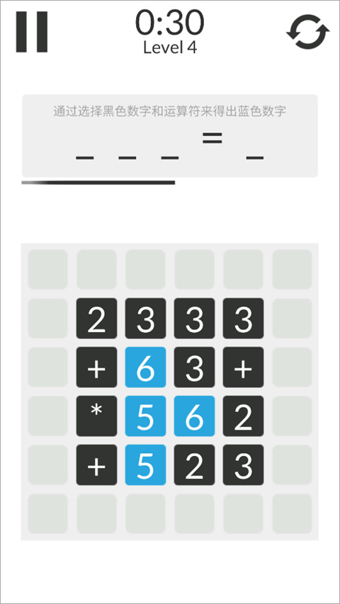 4、玩家需依次点击黑色区域中的数字与运算符,组成一条完整的算式;当该算式的结果等于蓝色目标数字时,即可顺利进入下一关。