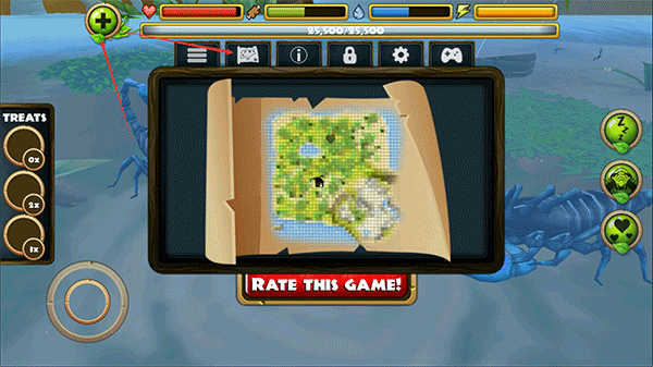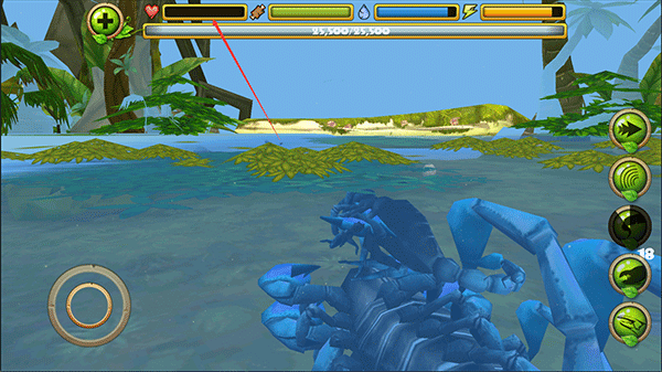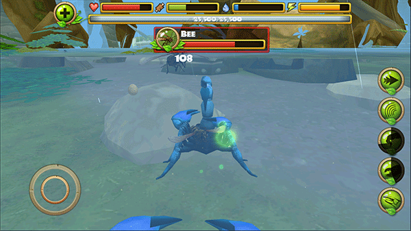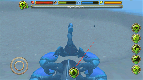 3、在野外探索时,你可以主动攻击蜻蜓、青蛙、蛇甚至鸟类等动物。右侧操作区域从上至下依次为:加速、眩晕、尾刺攻击、钳子攻击和进食功能,合理搭配使用是制胜关键。