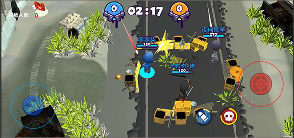 2、点击右边的摇杆进行射击,自动瞄准最近的敌人并标记为红色。