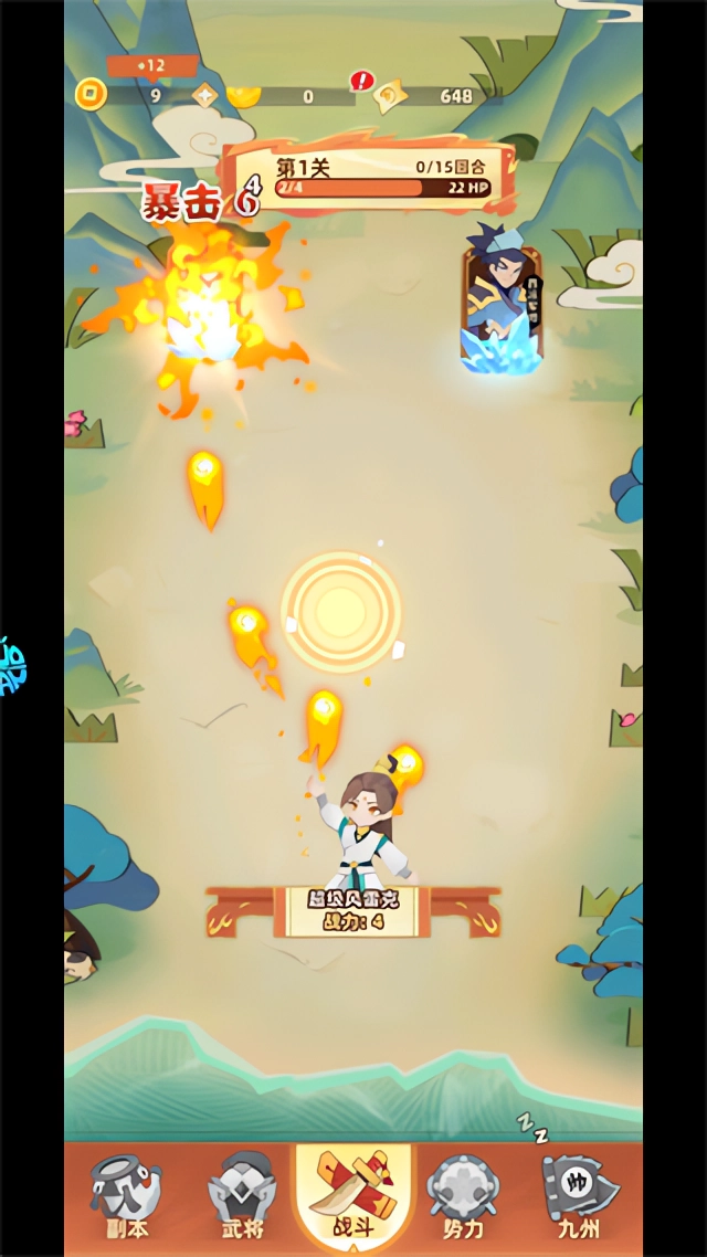 1、游戏玩法为点击屏幕消灭敌人闯关为主,点击作为前期主要伤害来源稍显费力,后期可以通过武将组合实现自动化闯关。