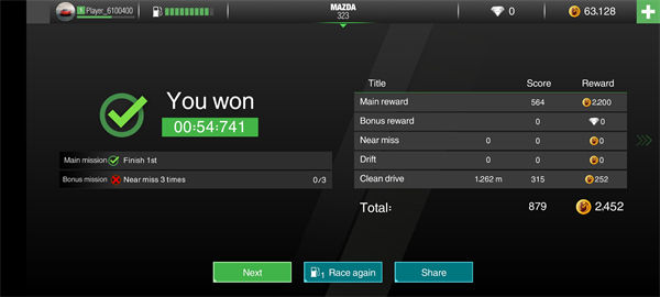 5、每成功完成一项任务,即可获得大量金币奖励,并可查看本次赛段的用时成绩;