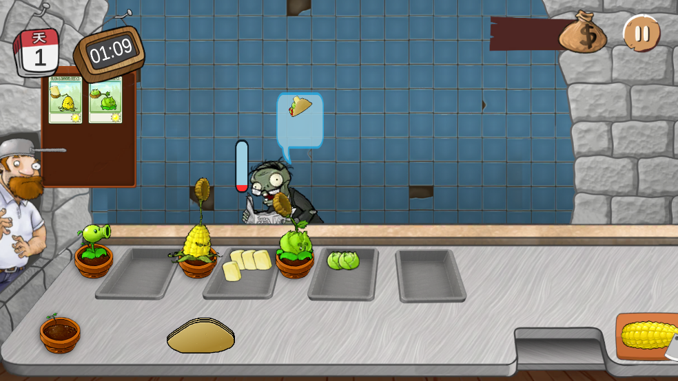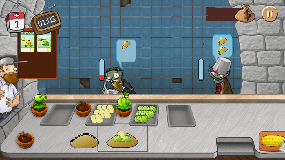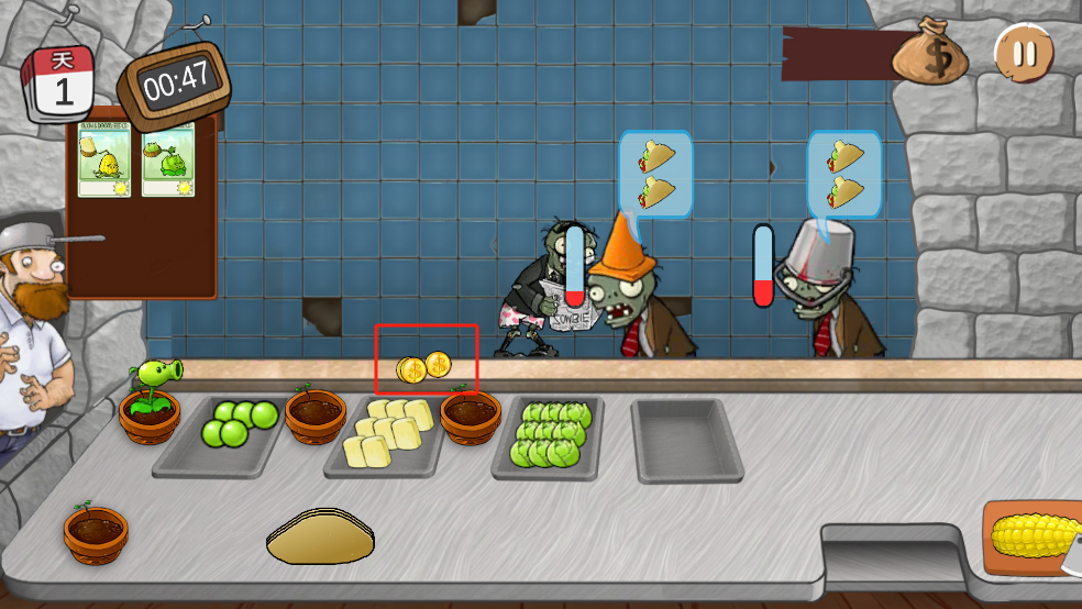 5、每一个僵尸都有一个耐心值,在耐心消耗完之前把沙威玛给僵尸就可以获得金币。