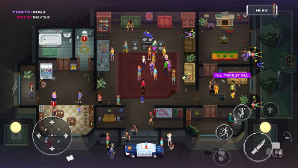 疯狂派对go全人物解锁版是一款由民间高手深度修改的破解版本,内置功能强大的作弊菜单,支持一键解锁全部角色、解锁所有关卡、无限击杀数、积分飙升、点击即胜以及游戏加速等实用功能。本作以复古80年代风格的2D像素画风呈现,玩家将化身一位被深夜派对噪音折磨得无法入眠的愤怒居民,决心潜入这场喧闹聚会,以各种隐蔽或暴力的方式逐一清除宾客。你可以耐心等待目标落单后悄然刺杀并藏匿尸体,也能设下陷阱精准狙杀派对组织者,再若无其事地混入人群。游戏中提供警察、忍者、电锯屠夫等多样职业杀手角色,每位角色拥有独特技能与战术风格,配合丰富的互动道具与环境机关,带来极具策略性与沉浸感的暗杀体验。凌晨三点,复仇开始——选择你的身份,掌控节奏,在不被察觉的前提下完成完美清除!