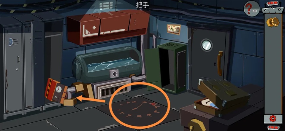 5、将【把手】插入柜内盒子,抽出内部装置;观察地板上绘制的钟面——时针指向【6】,分针指向【11】(左侧大指针为分针,右侧为时针),将盒内钟表调整至相同时间,获得【密码纸】。