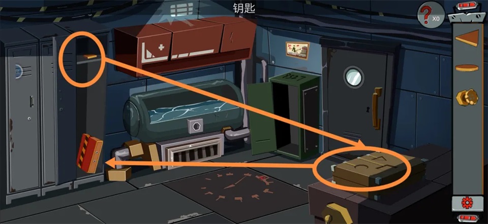 6、把【水龙头】安装到水箱接口处,排空箱内积水;根据【密码纸】提示,调节水箱底部四个水阀至正确位置,最终获得【钥匙】,成功离开更衣室。