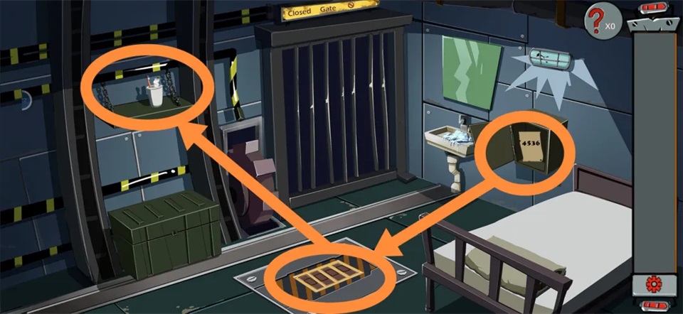 - 探索场景点击调查房间内所有可疑物品(床、柜子、马桶、通风口等)。