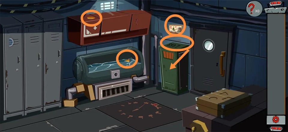 2、门边柜子顶部标有密码【9527】,输入后打开柜子,获得【水龙头】和氧气瓶;同时完成柜顶拼图,得到【柜子钥匙】。