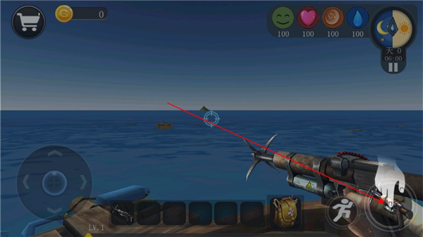 4、右侧按钮长按可激活工具进行射击或捕捞操作,是获取物资的关键手段。