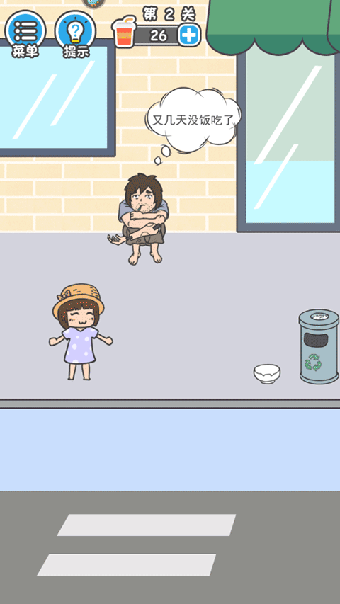 2、捡起路边的碗,按动拖住到乞丐身上,就会有路人施舍一点钱给他,即通关成功;