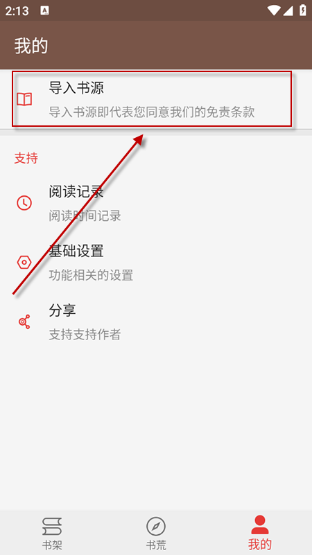 1、在本站内下载安装并打开软件,点击右下角“我的”进入个人主页,在个人主页中找到“导入书源”选项,点击进入,在书源列表中选择需要导入的平台。